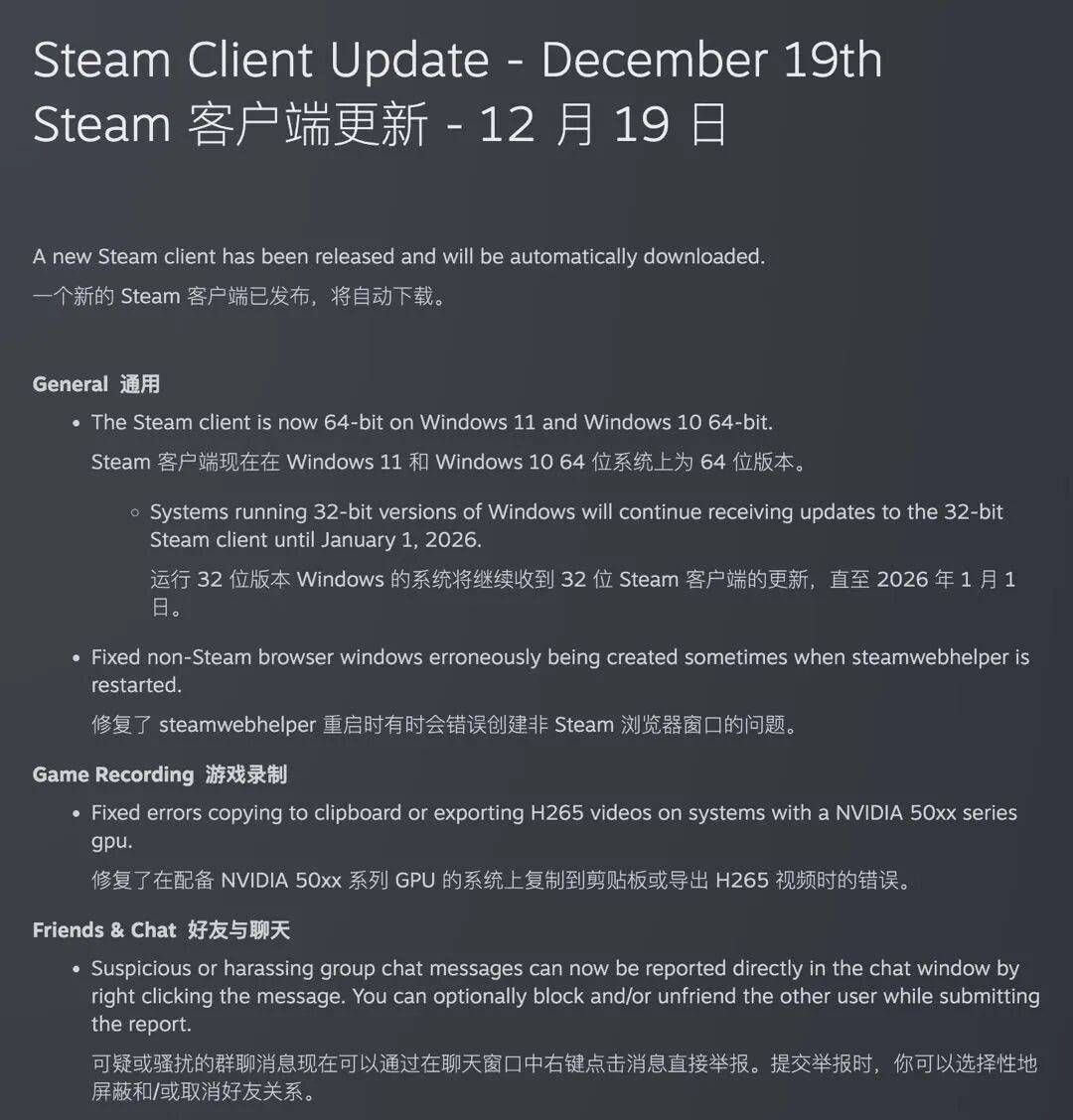 此前,官方已在 12 月 19 日的客户端更新说明中明确过这一时间表;该调整主要为简化维护并顺应行业淘汰 32 位软件的趋势。