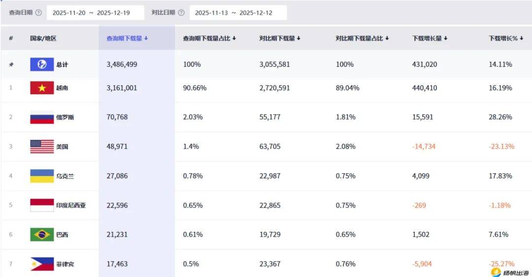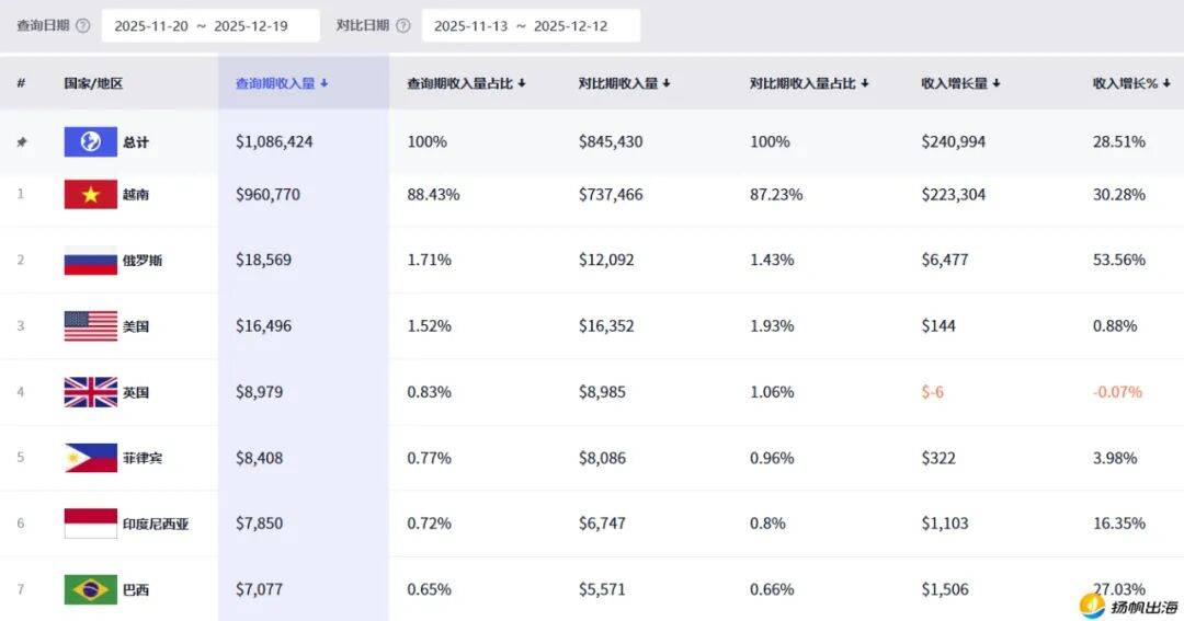 insightrackr数据显示,从11月20日至12月19日(30天时间),《Builda》在全球APP Store、安卓等渠道共积累了348.6万下载量,其中,约90.7%下载来自越南,同时也有俄罗斯、美国等地区贡献部分下载量。