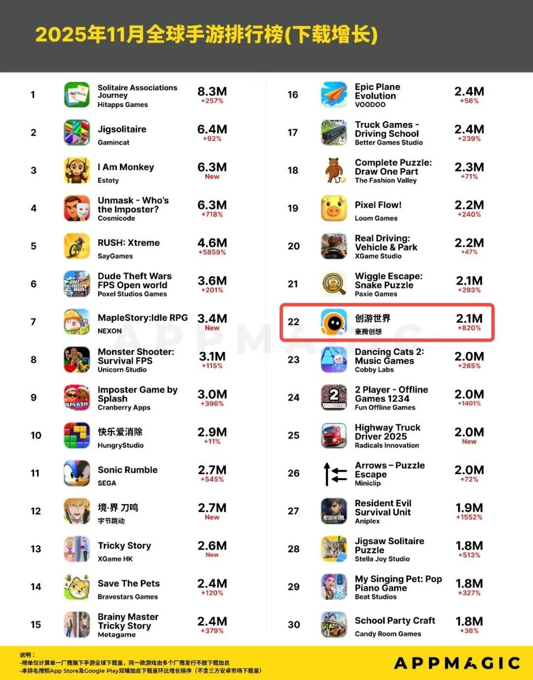 回到《Builda》,其还入围了AppMagic发布的《2025年11月全球手游下载增长Top30》,以近210万全球月下载量位居第22名。根据AppMagic数据估算与追踪,自11月起,该游戏在双端加大买量投放,推动全球下载量环比增长约800%,11月29日单日下载量突破47万次,创历史新高。